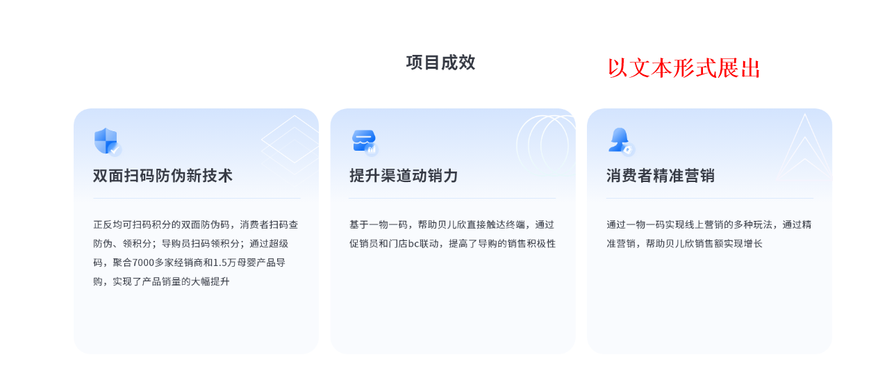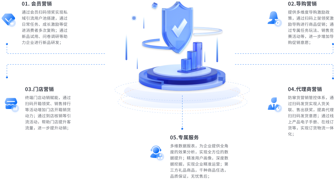 赋能企业商品流通全流程各角色,为每个角色提供专属终端,覆盖企业全场景、全渠道、全业务,实现企业全流程快速连接,数据统一归集。围绕企业生产经营全流程,基于超级一物一码身份码数字赋码体系,结合BI数据驱动的动态营销策略,助力企业实现快速铺货、精准引流、一店一策、自动返利,达成销量提升、成本降低、效率增加等效果